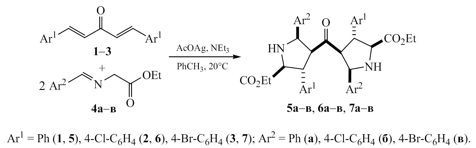 Взаимодействие диарилиденацетонов 1–3 с двукратным избытком арилальдимина этилового эфира глицина 4a–в проводили в толуоле в присутствии ацетата серебра и полуторакратного (по имину) избытка триэтиламина без доступа света [20]. Ход реакции контролировали методом ТСХ. Во всех случаях, в качестве основного продукта (96–97%), по данным спектроскопии ЯМР 1Н, получались рацемические смеси соответствующих диаддуктов – (±)-диэтил-4,4′-карбонилбис(3,5-диарилпирролидин-2-карбоксилатов) 5a–в, 6a–в, 7a–в (схема 1). Полученные соединения выделяли методом кристаллизации из смеси петролейного эфира и CH2Cl2 (4:1).