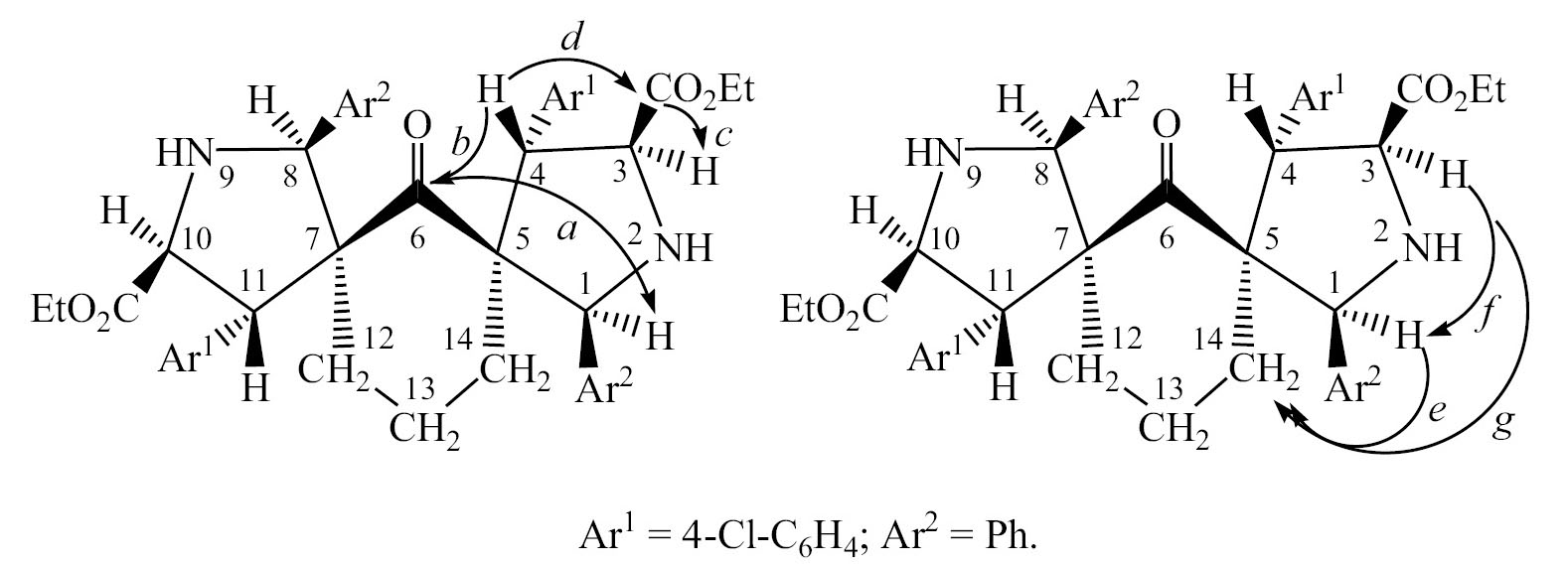 Строение соединения 14 устанавливали методами корреляционной спектроскопии ЯМР. Расположение заместителей в пирролидиновом цикле определяли на основании спектра 1H–13C HMBC, аналогично диаддуктам. Стереоселективность реакции определяли посредством NOESY-эксперимента (рис. 6): в спектре наблюдаются кросс-пики пространственно сближенных пар протонов Н1–Н10′ (a), Н3–Н10′ (b) и Н1–Н3 (c) (схема 7, на примере одного из энантиомеров).