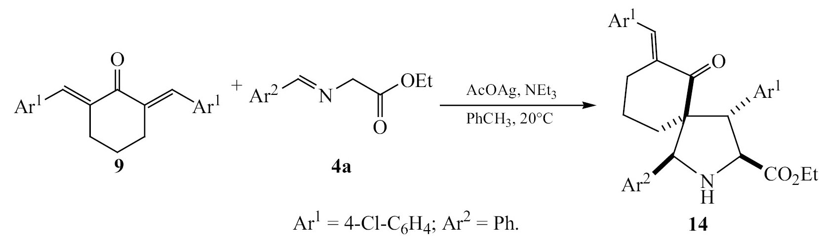 Далее в качестве диполярофилов в аналогичных условиях нами были исследованы диарилиденциклогексаноны 8–10. Продуктами циклоприсоединения в данном случае являются спироциклические производные пирролидина, что приводит к увеличению жесткости соединения, а также ограничивает его конформационную подвижность.