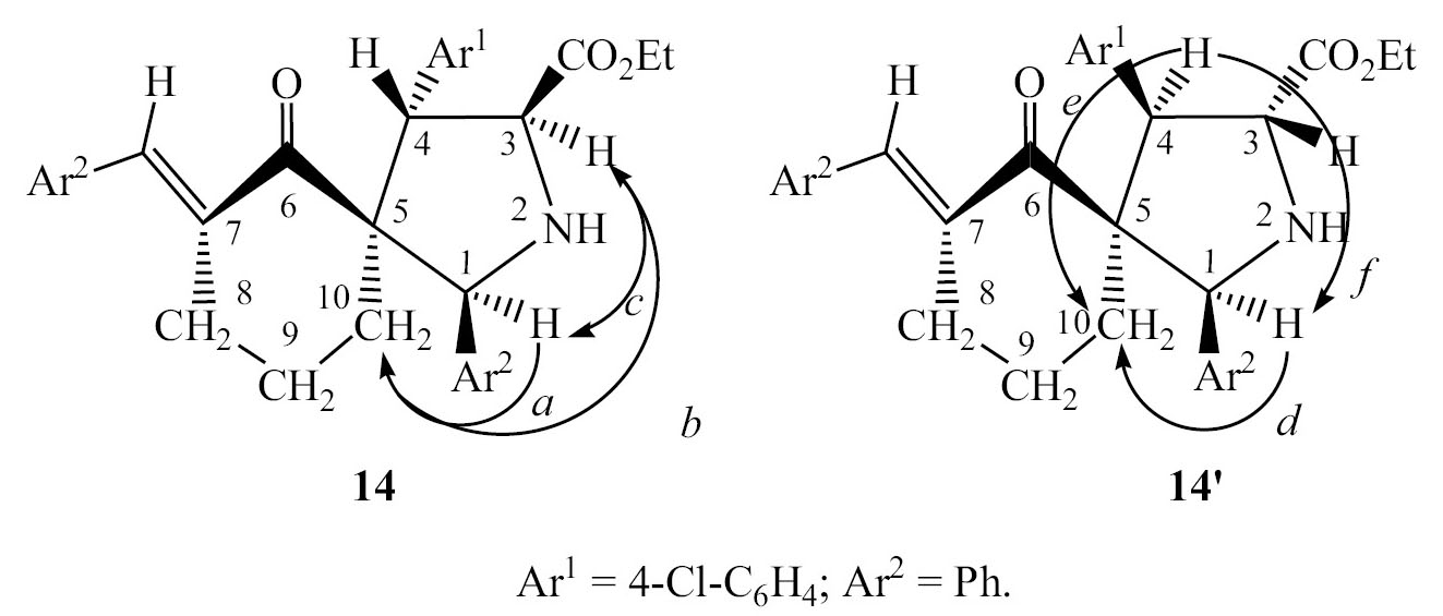 Несмотря на возможность изомеризации, можно однозначно сказать, что предшественником диаддуктов 11a–в, 12a–в, 13a–в является моноаддукт с конфигурацией атомов пирролидинового кольца аналогичной соединению 14. Циклоприсоединение с участием 14′ должно давать продукт с различным пространственным строением циклов и, следовательно, приводить к увеличению количества сигналов в спектрах ЯМР. Последовательность изомеризация моноаддукта–циклоприсоединение–изомеризация второго цикла также исключается, поскольку строение полученного таким образом диаддукта не соответствует данным NOESY-эксперимента.