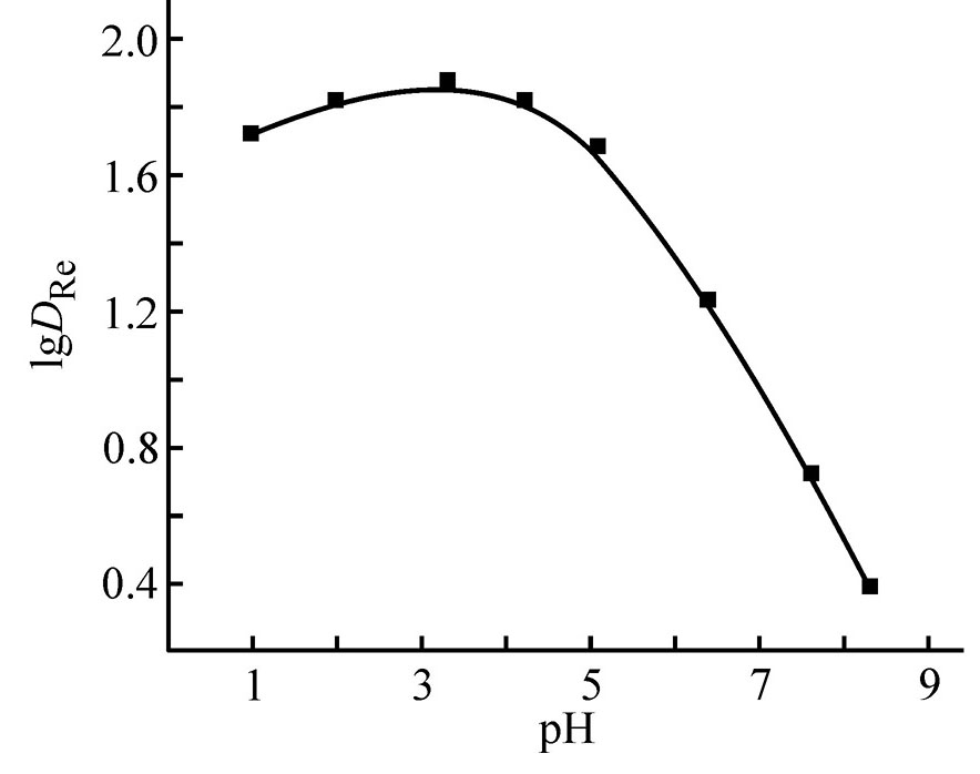 Рассмотрено влияние состава водной фазы на эффективность экстракции Re(VII) раствором соединения 8 в дихлорэтане. При постоянной концентрации ионов Cl– в водной фазе зависимость коэффициента распределения рения (DRe) от рН равновесной водной фазы выражается кривой с максимумом (рис. 1). Увеличение DRe с уменьшением величины рН связано с увеличением доли протонированной формы экстрагента (L) в органической фазе, что способствует экстракции Re(VII) в виде ионной пары LH+ReO4– по анионообменному механизму: