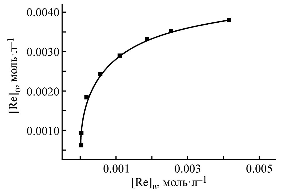 Стехиометрическое соотношение Re(VII)–экстрагент в экстрагируемых комплексах, определенное методом разбавления, составляет 1:1 (рис. 3), что соответствует экстракции ReO4– в виде ионных ассоциатов по уравнению (1) в условиях избытка экстрагента. Кроме того, при избытке Re(VII) в органическую фазу переходят также комплексы LH22+(ReO4–)2 со стехиометрическим соотношением Re(VII):экстрагент = 2:1. На это указывают данные по насыщению раствора экстрагента рением(VII) (рис. 4).