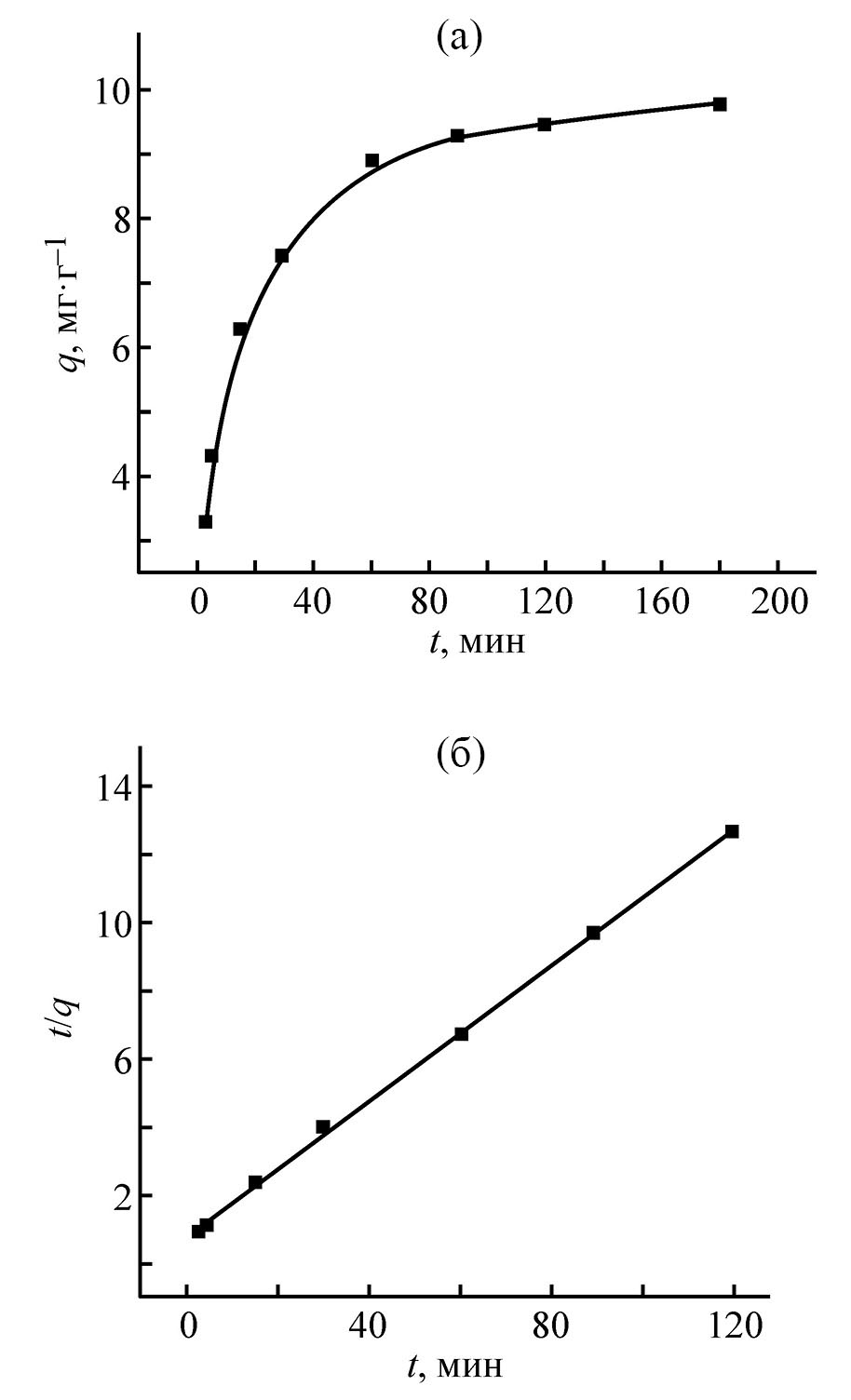 где k1 и k2 – константы скорости, qe и qt (мг/г) – концентрация Re(VII) в фазе сорбента при равновесии и во время t (мин) соответственно. Линейный характер отмечен только для зависимости t/qt от t (рис. 5б), что характерно для процессов хемосорбции [19]. Значения k2 и qe составляют 0.015±0.001 и 9.85±0.49 г/(мг·мин). Вычисленное значение qe хорошо согласуется с экспериментальным значением.