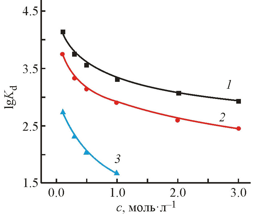 где с0 и сe – концентрации Re(VII) в растворе до и после сорбции. Погрешность определения Kd не превышала 10%. Концентрацию HClO4, HNO3, HCl и H2SO4 в равновесных водных фазах определяли потенциометрическим титрованием стандартизованным раствором NaОН.