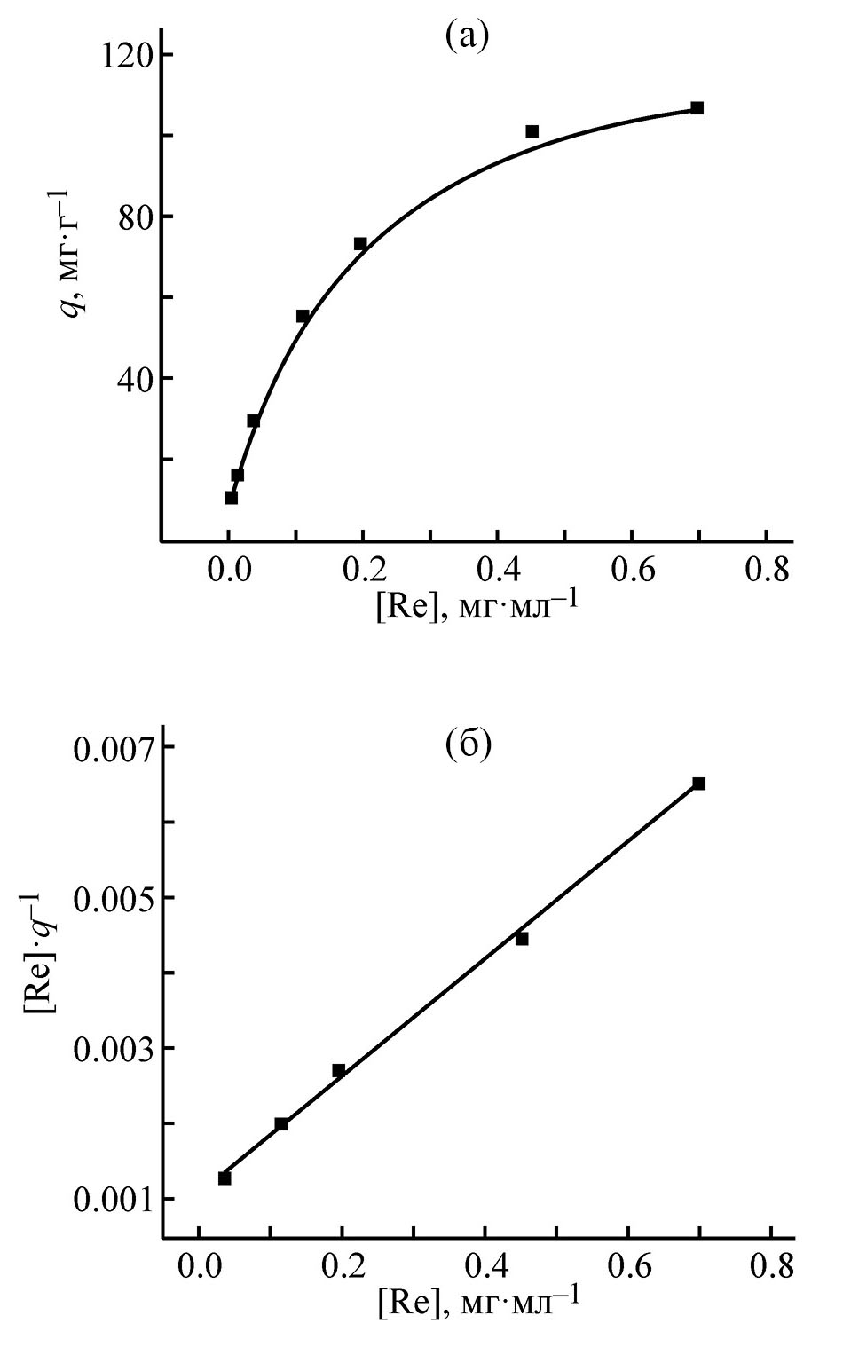Рис. 7. Распределение Re(VII) между 1 М. раствором H2SO4 и полимерным сорбентом, модифицированным соединением 8 (V/m = 200 мл/г) (a) и зависимость [Re]/qe от [Re] (б).