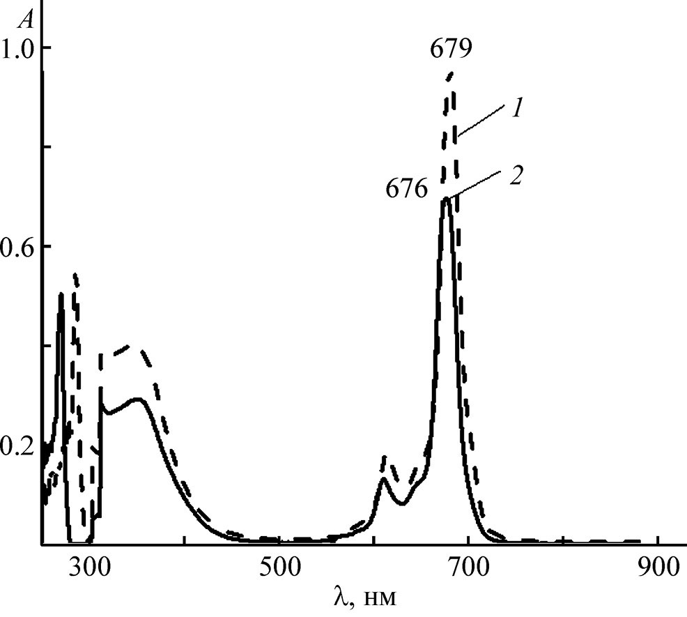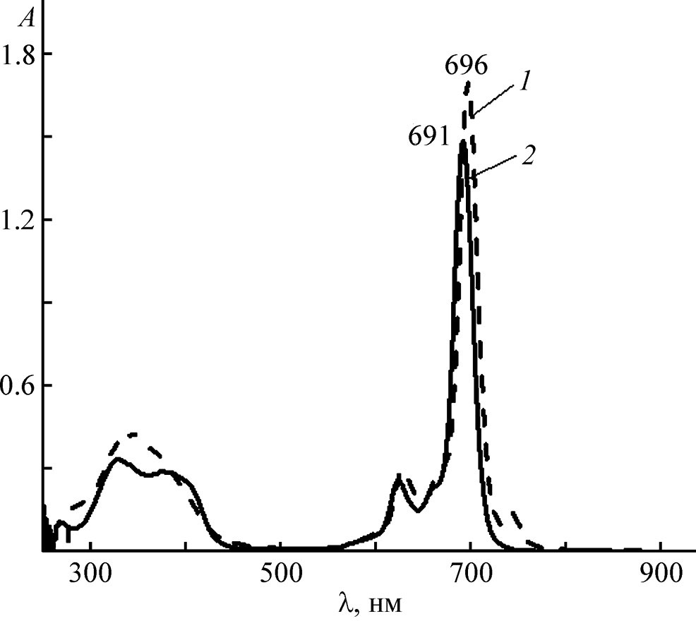 Рис. 2. Электронные спектры поглощения растворов тетра-4-(4-бромфенокси)фталоцианина цинка в хлороформе (1, сMPc = 4.5·10–6 моль/л) и ДМФА (2, сMPc = 3.2·10–6 моль/л).
