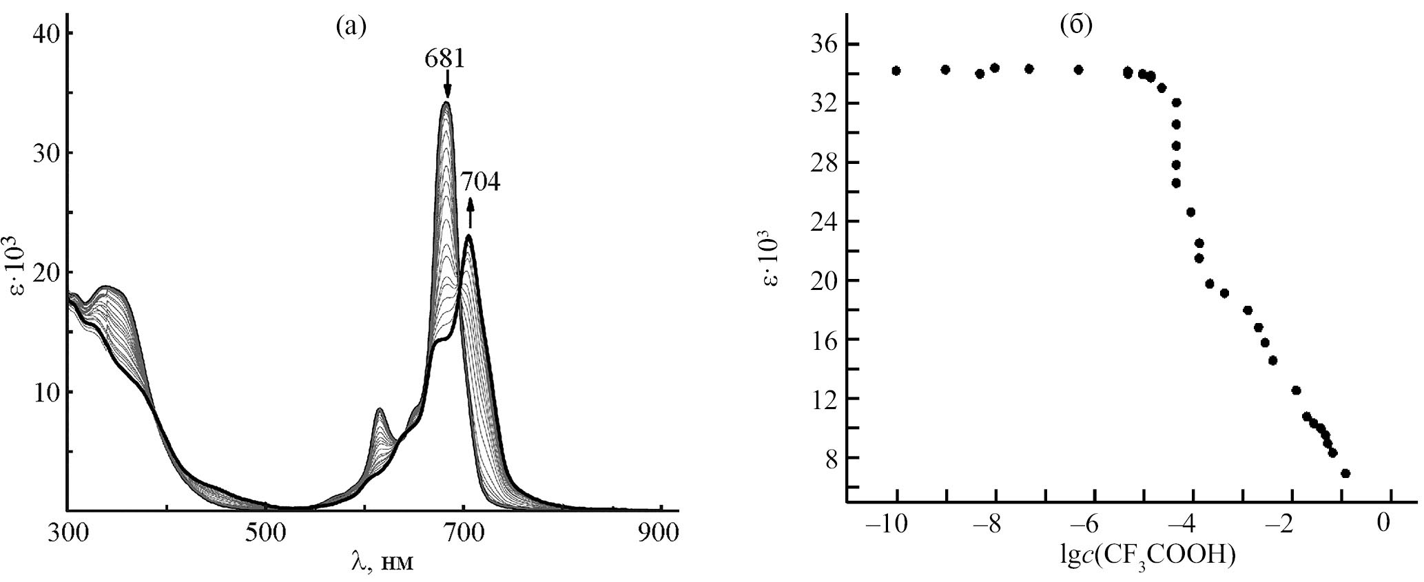 Рис. 4. Изменение электронных спектров поглощения при титровании раствора тетра-4-(4-бромфенокси)фталоцианина цинка (сMPc = 7.61·10–5 моль/л) в толуоле трифторуксусной кислотой (а) и общий вид кривой титрования при 681 нм (б).