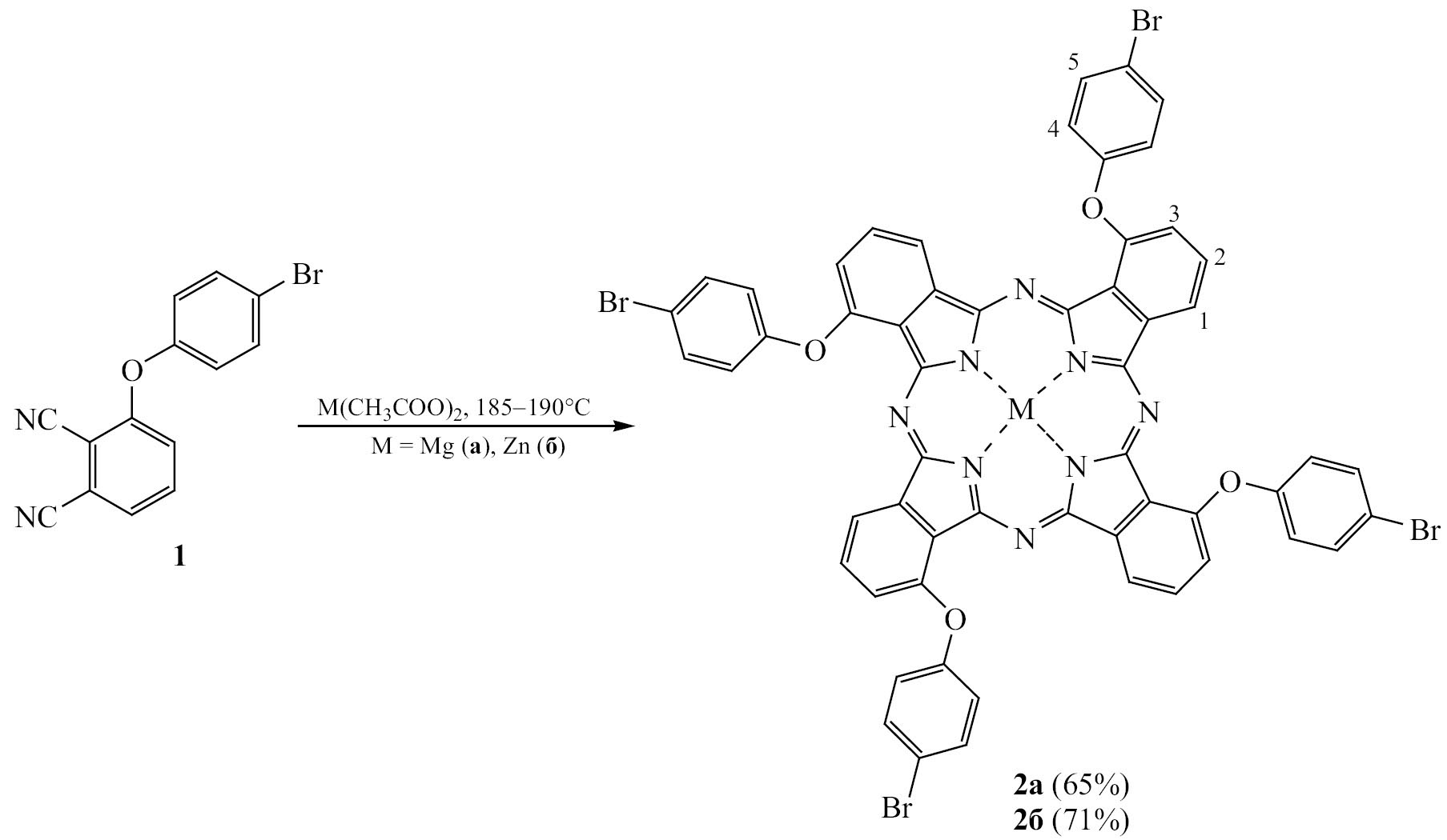 Синтез тетра-3-(4-бромфенокси)фталоцианинов магния и цинка (2а, б). Смесь 0.30 г (1 ммоль) 3-(4-бромфенокси)фталонитрила 1 и 0.38 ммоль ацетата цинка или магния сплавляли в термостойкой пробирке, помещенной в электрическую печь, при температуре 190–195°С в течение 6 ч до затвердевания реакционной массы. Полученную смесь охлаждали до комнатной температуры, целевой продукт экстрагировали хлороформом, затем очистку проводили колоночной хроматографией на силикагеле М60, элюируя хлороформом.