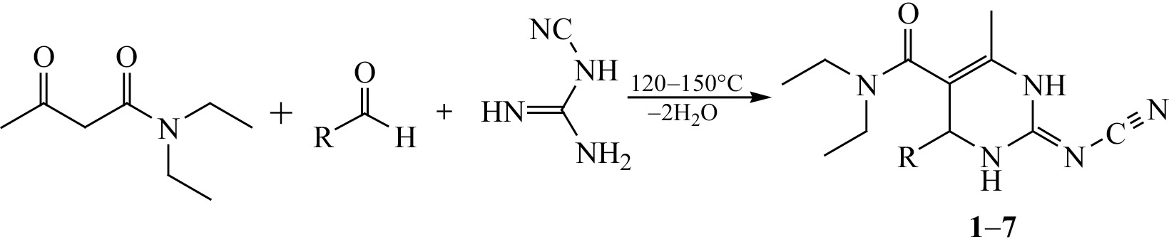 В настоящей работе в реакцию с ароматическими альдегидами и N-цианогуанидином в аналогичных условиях был вовлечен N,N-диэтил-3-оксобутанамид и получены ранее неизвестные 2-цианоимино-1,2,3,4-тетрагидропиримидины, содержащие N,N-диэтиламидную группу в 5 положении гетероцикла (схема 1). Реакция протекала при нагревании до 120–150°С в течение 10 мин и приводила к образованию целевых соединений с выходом 26–58%.
