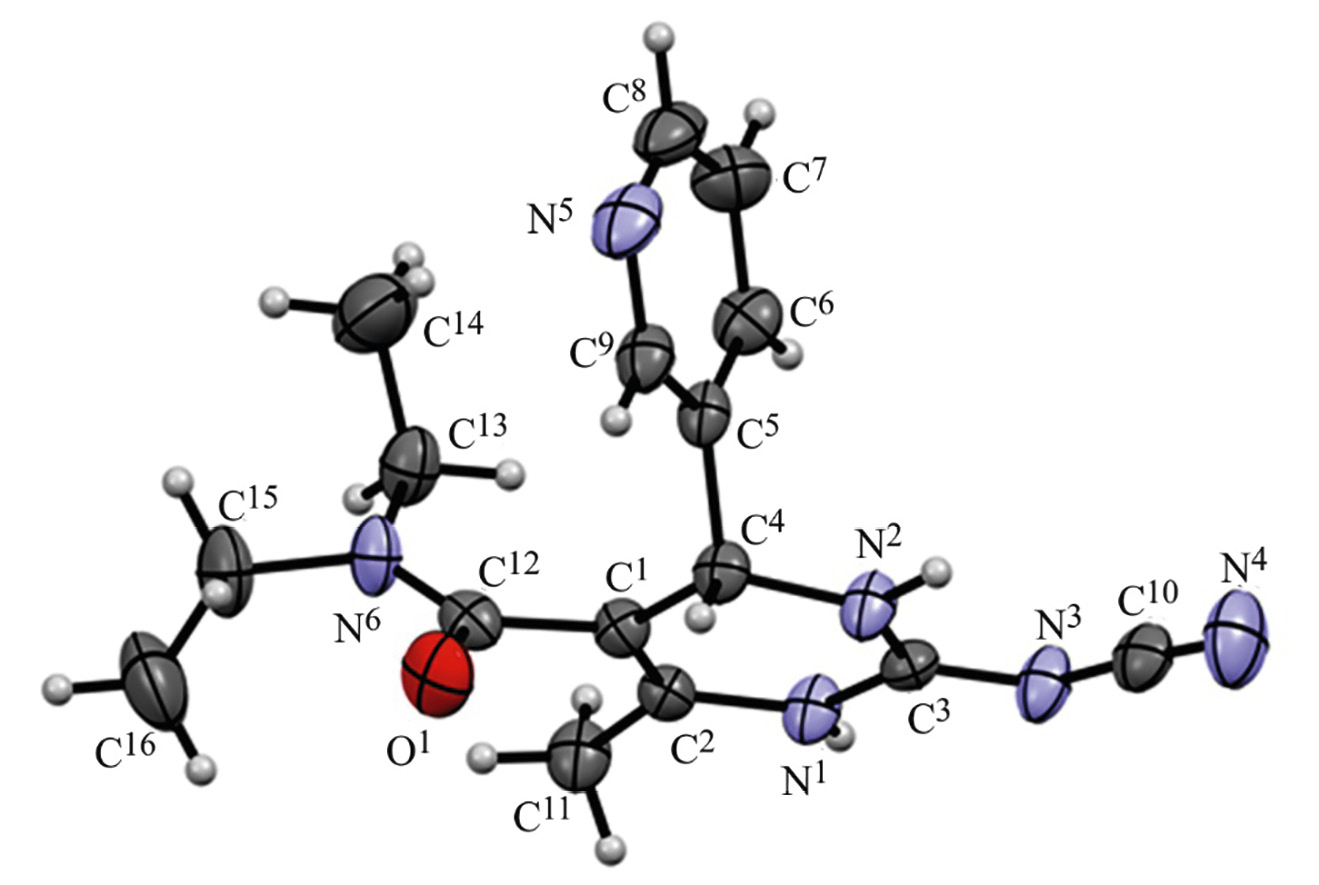 Таким образом, предложен эффективный метод синтеза новых 2-цианоимино-1,2,3,4-тетрагидропиримидинов, содержащих N,N-диэтиламидную группу в 5 положении гетероцикла, на основе реакции Биджинелли между N,N-диэтил-3-оксобутанамидом, ароматическими альдегидами и N-цианогуанидином. Строение полученных соединений однозначно установлено методами ИК, ЯМР 1Н спектроскопии и рентгеноструктурного анализа.