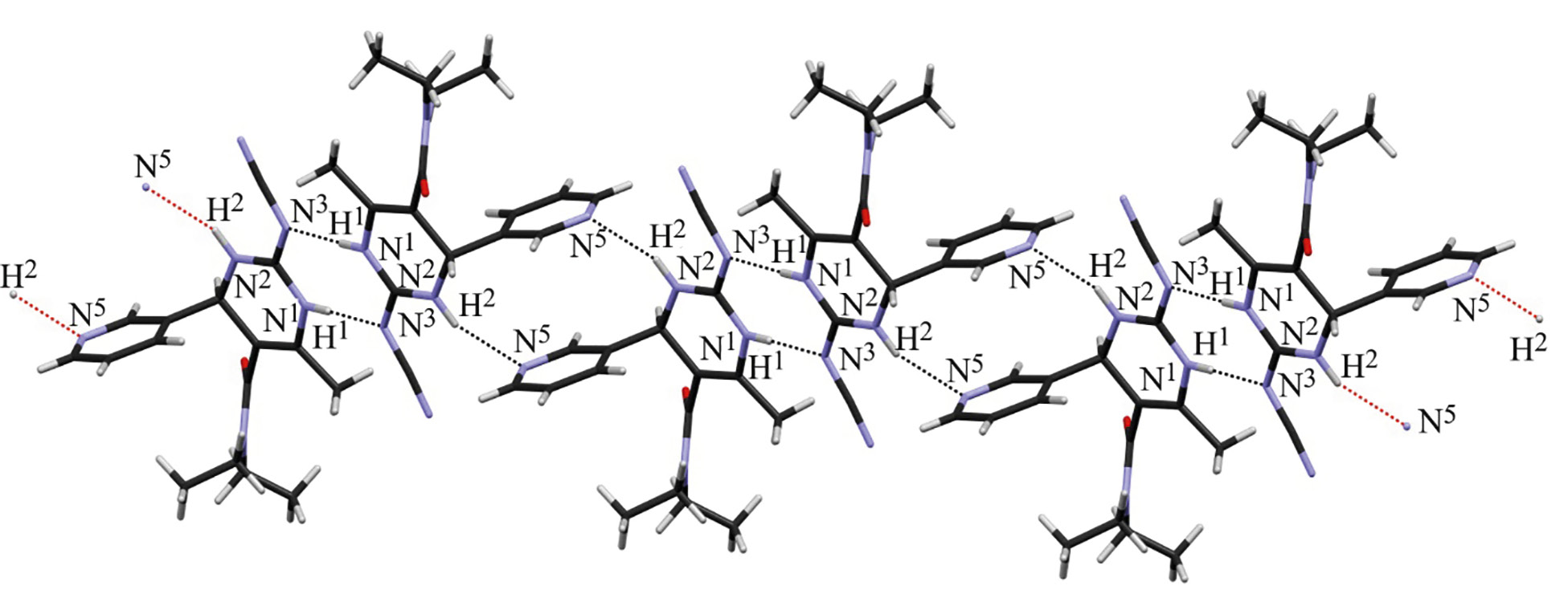 Соединение 1 кристаллизуется в центросимметричной пространственной группе триклинной сингонии. Пиримидиновый цикл плоский (RMSD 0.018 Å). Кратная связь C3=N3 сильно делокализована: ее длина [1.334(3) Å] оказывается больше, чем длины связей C3–N1 и C3–N2 [1.327(3) и 1.326(3) Å]. В кристалле молекулы связаны в бесконечные цепочки за счет межмолекулярных водородных связей N1–H1∙∙∙N3 и N2–H2∙∙∙N5 (рис. 2).
