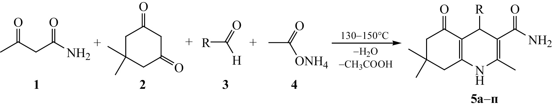 Нами изучено взаимодействие амида ацетоуксусной кислоты 1 с димедоном 2, ароматическими (гетероциклическими) альдегидами 3 и ацетатом аммония 4 в отсутствие растворителя. Проведенные исследования показали, что циклоконденсация успешно протекает при сплавлении реагентов с образованием замещенных 4-арил(гетарил)-2,7,7-триметил-5-оксо-1,4,5,6,7,8-гексагидрохинолин-3-карбоксамидов 5a–п (схема 1). Следует отметить, что реакция приводит к высоким выходам при наличии в ароматическом альдегиде электроноакцеторного заместителя. Стерического эффекта в случае заместителя в орто-положении арилкарбальдегида не наблюдается. Выходы в случае орто-замещенных альдегидов не уступают, а в ряде случаев и превышают таковые для пара-замещенных.