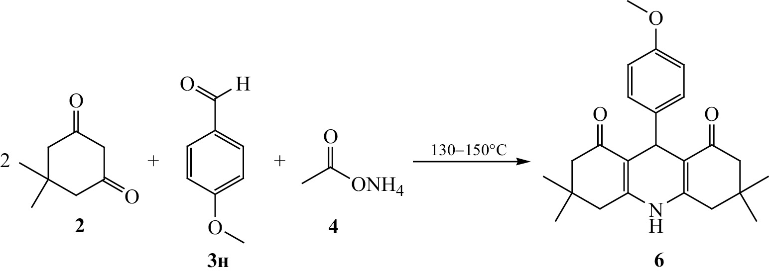 Известно, что без участия амида в аналогичных условиях конденсация протекает с образованием замещенных акридинов [15, 16]. Примеси акридина были замечены нами в конечных продуктах при использовании ацетоацетамида в эквимолярном соотношении с остальными реагентами. Однако 10%-ный избыток амида позволил полностью избавиться от наличия примесного продукта еще на стадии выделения 5-оксо-1,4,5,6,7,8-гексагидрохинолин-3-карбоксамидов, предшествующей очистке. Для подтверждения характера примесных продуктов взаимодействием димедона с п-метоксибензальдегидом и ацетатом аммония, взятых в соотношении 2:1:1, в аналогичных условиях получен 3,3,6,6-тетраметил-9-(4-метоксифенил)-3,4,6,7,9,10-гексагидроакридин-1,8(2H,5H)-дион 6 (схема 2).