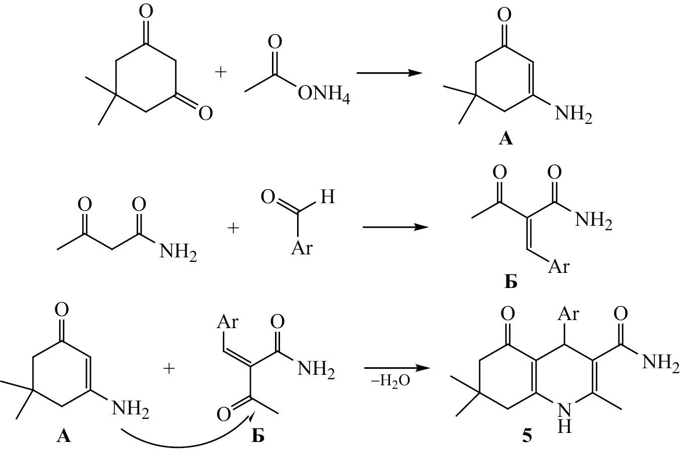 Вероятный механизм образования 4-арил(гетарил)-2,7,7-триметил-5-оксо-1,4,5,6,7,8-гексагидрохинолин-3-карбоксамидов 5a–п показан на схеме 3. Предположительно, димедон взаимодействует с аммиаком с образованием промежуточного интермедиата А. В результате конденсации ацетоацетамида с ароматическим альдегидом образуется промежуточный непредельный продукт Б. Дальнейшая циклизация полученных интермедиатов А и Б приводит к образованию гексагидрохинолин-3-карбоксамидов 5a–п.