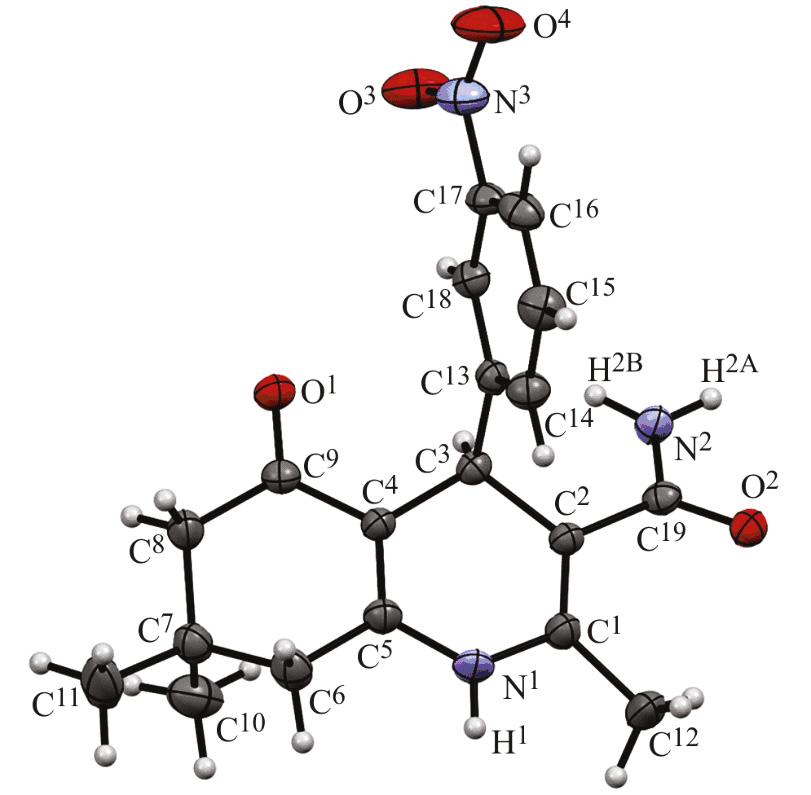 2,7,7-Триметил-4-(4-нитрофенил)-5-оксо-1,4,5,6,7,8-гексагидрохинолин-3-карбоксамид (5п). Выход 51%, т. пл. 272–274°С (этанол). ИК спектр, ν, см–1: 3444 (N1H), 3287, 3257 (CONH2), 1672 (CO), 1641 (CON). Спектр ЯМР 1Н, δ, м. д.: 0.78 с (3Н, С7СН3), 0.95 c (3Н, С7СН3), 1.90 д (1H, C8HAHB, J 16.0 Гц), 2.05 с (3Н, С2СН3), 2.08 д (1H, C8HAHB, J 16.2 Гц), 2.22 д (1H, C6HAHB, J 16.9 Гц), 2.33 д (1H, C6HAHB, J 16.9 Гц), 4.92 с (1Н, С4Н), 6.74 уш. с (1Н, NН2), 6.85 уш. с (1Н, NН2), 7.37 д (2Н, 4-NO2С6Н4, J 8.6 Гц), 8.02 д (2Н, 4-NO2С6Н4, J 8.6 Гц), 8.62 с (1Н, NН). Спектр ЯМР 13C, δС, м. д.: 17.76, 27.14, 29.44, 32.48, 38.59, 50.74, 107.63, 109.26, 123.50, 129.23, 136.47, 146.09, 151.38, 155.03, 170.06, 194.00. Масс-спектр (ESI), m/z: 354.1455 [M – H]+ (вычислено для C19H21N3O4: 355.39).