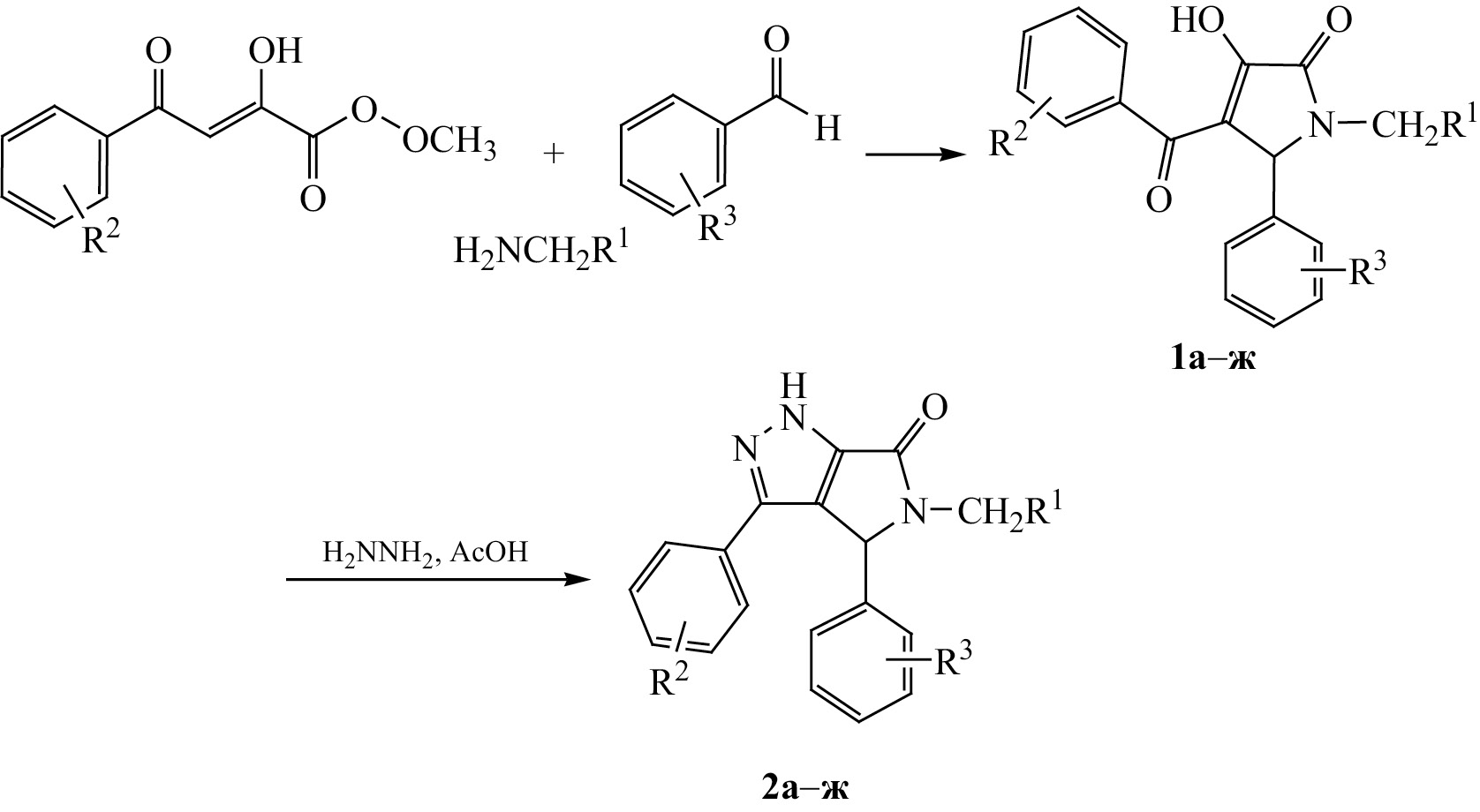 Вновь синтезированные гидрохлориды 1-аминоалкил-3-гидрокси-3-пирролин-2-онов 1а–е вводили во взаимодействие с гидразингидратом при кипячении в ледяной уксусной кислоте в течение 1.5 ч. Во всех случаях с выходами 50–92% образуются пирроло[3,4-c]пиразолы 2а–е, растворимые в этаноле, диметилсульфоксиде, диметилформамиде и воде. Однако целевой продукт 2ж был выделен лишь после 3-часового кипячения в том же растворителе с выходом 8% в форме ацетата.