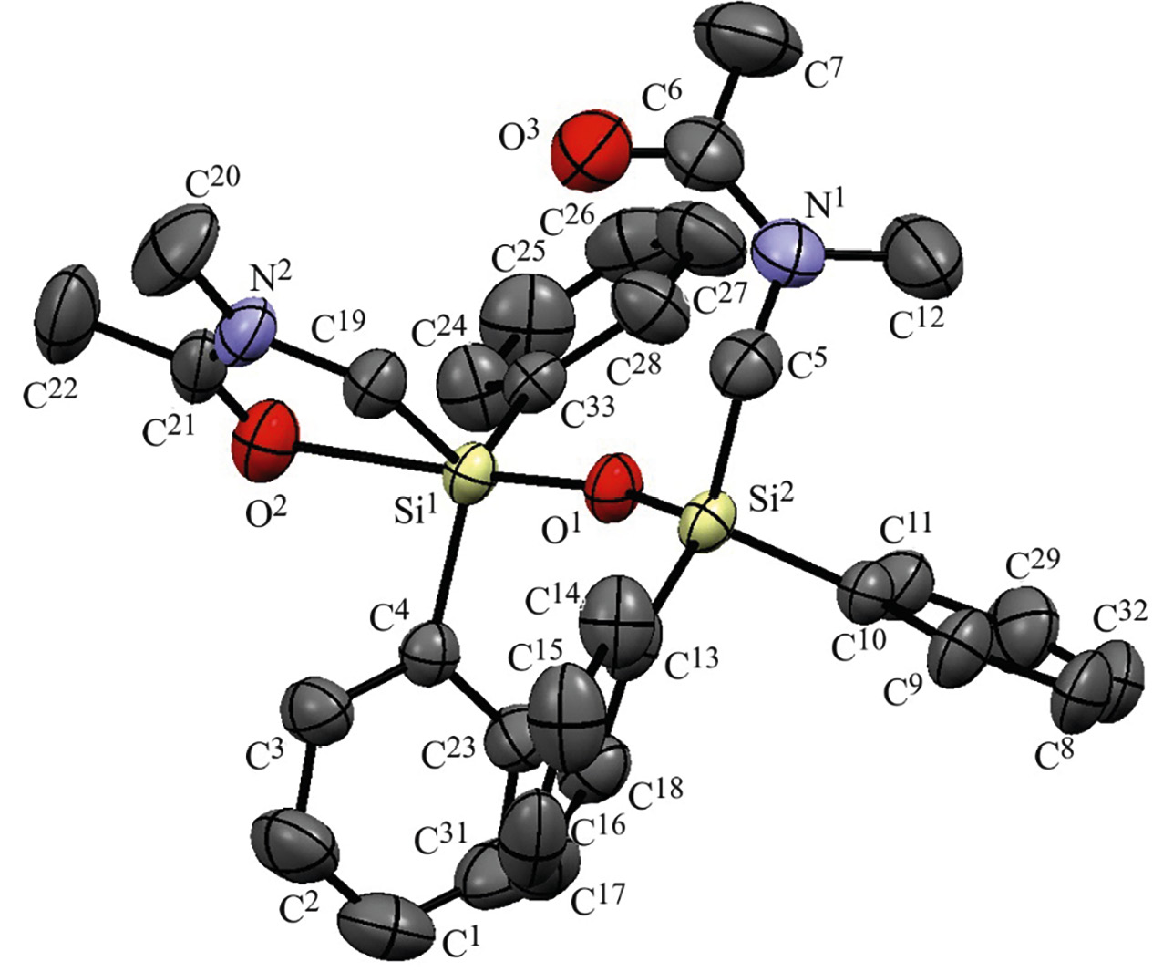 N1–C6 | 1.333(4) | O1Si2C13 | 113.5(1) | O1Si1C33C28 | –23.7(2) |