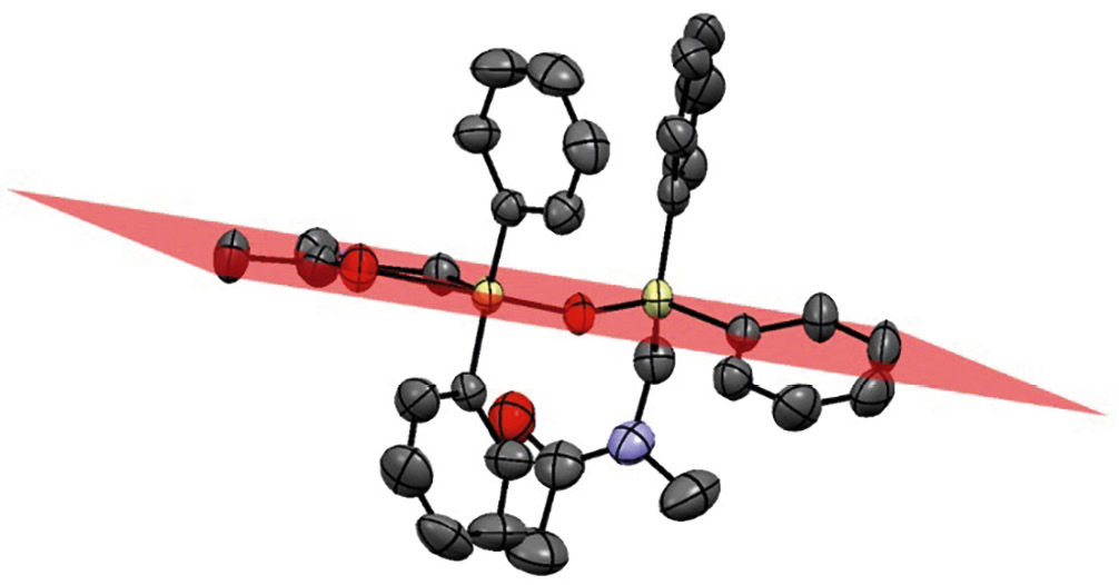 Таким образом, гидролиз N-[хлор(дифенил)силил]метил-N-метилацетамида влагой воздуха приводит к образованию 1,1,3,3-тетрафенил-1,3-бис(N-метилацетамидометил)-1,3-дисилоксана. Рентгеноструктурный анализ показал, что этот силоксан в кристалле существует в виде нейтрального (O–Si) монохелатного пентакоординированного соединения кремния с аксиальной силоксановой группой.