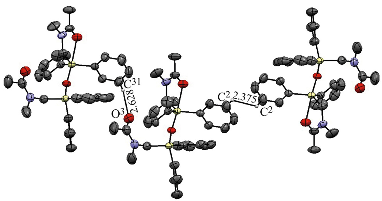 Молекулы 1,1,3,3-тетрафенил-1,3-бис(N-метилацетамидометил)-1,3-дисилоксана связаны между собой двумя короткими контактами: между атомом водорода фенильной группы и некоординированной карбонильной группой СArН···О=C (2.629 Å) и атомами водорода фенильных групп СArН···НСAr (2.375 Å) (рис. 3). Эти слабые взаимодействия обеспечивают существование кристаллической структуры соединения 2.