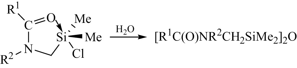 Устойчивое развитие и высокая актуальность исследований в области кремнийорганических соединений, содержащих гипервалентный атом кремния, обусловлены их уникальными структурными особенностями, высокой реакционной способностью, возможностью применения в синтетической органической химии и химии материалов как в качестве исходных реагентов, так и генерированных in situ активных интермедиатов [1–9]. (O–Si) Хелатные N-силилметилированные производные карбоксамидов и родственных соединений A (схема 1) являются типичными представителями соединений гипервалентного кремния [1–3, 10–28]. Среди них наиболее изучены соединения с координационным узлом C=O→SiC3X, в которых аксиальный заместитель является либо атомом галогена либо электроноакцепторной группой [X = Hlg, OTf, OAr, OC(O)R]. Следует отметить, что (O–Si) хелаты, содержащие атом хлора в качестве аксиального заместителя, легко гидролизуются с образованием соответствующих силоксанов с тетракоординированным атомом кремния (cхема 2) [20, 27, 29–36]. Их строение доказано методами ИК, ЯМР спектроскопии и рентгеноструктурного анализа, а механизм их образования в результате гидролиза подробно обсуждается в работе [35].