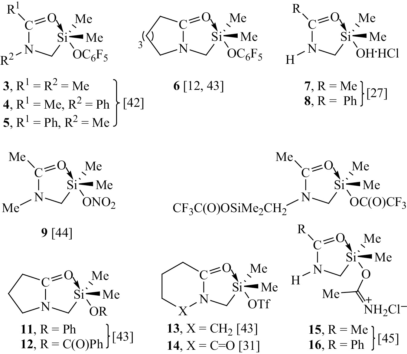 (O–Si) хелаты А, содержащие в качестве аксиального заместителя кислородсодержащую группу OR, все еще мало изучены. На схеме 4 приведены соединения, строение которых доказано методами спектроскопии и/или рентгеноструктурного анализа [12, 27, 31, 42–45]. Значения геометрических параметров хелатной группы силоксана 2 и соединений 6, 8, 11–15 с кислородсодержащей аксиальной группой (схема 4, табл. 3) находятся в хорошем согласии [27, 31, 43, 45].