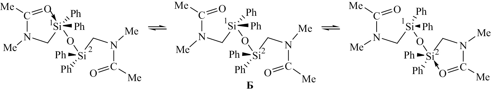 В спектрах ЯМР 1H, 13C и 29Si соединения 2, зарегистрированных при комнатной температуре в растворе дейтерохлороформа, присутствует единственный набор сигналов, что указывает на эквивалентность двух групп MeC(O)NMeCH2SiPh2. Известно, что в (O–Si) хелатных соединениях наблюдается пермутационная изомеризация – стереодинамический процесс быстрого (в шкале ЯМР) позиционного обмена заместителей в координационном узле [15]. По-видимому, в растворе соединения 2 протекает аналогичный процесс. Судя по результатам рентгеноструктурного анализа, дативная связь C=O→Si в соединении 2 является слабой, ее длина только на 0.065 Å меньше, чем в соединении 11 [2.302(2) и 2.367(2) Å соответственно]. Поэтому в растворе хлороформа возможен разрыв дативной связи C=O→Si1 с образованием силоксана Б с двумя тетракоординированными атомами кремния и формирование новой дативной связи C=O→Si2 (схема 5).