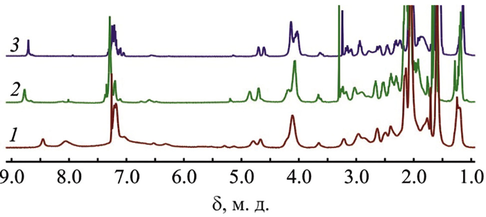 Рис. 2. Спектры ЯМР 1H (500.2 МГц) тетрапептида 1 в CDCl3 (1), ацетоне-d6 (2), смеси ацетон-d6–D2O (8:2, об.) (3).