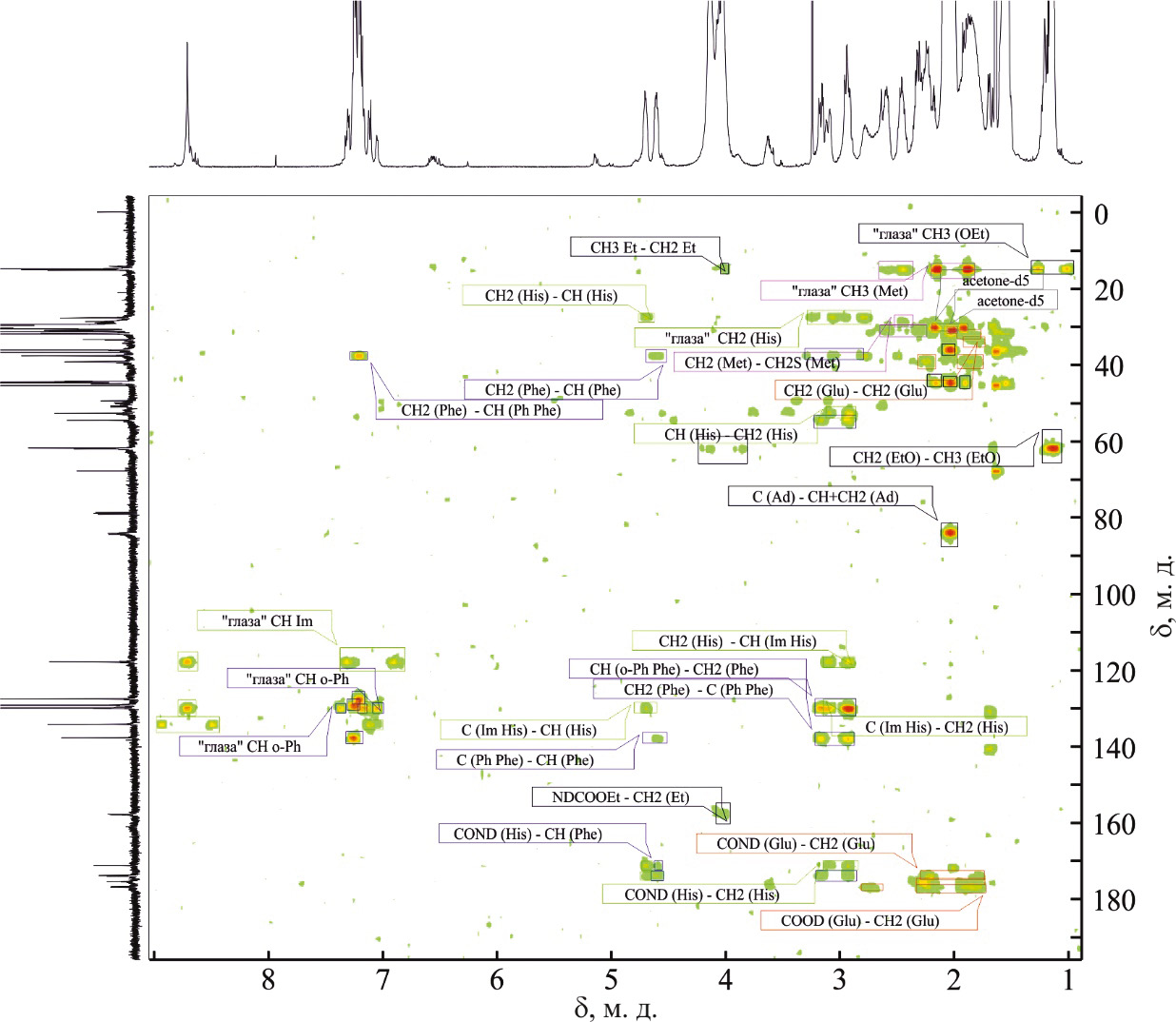 Наилучшее разрешение в спектре ЯМР 1Н в смеси ацетон-d6–D2O (8:2, об.) позволило сделать отнесение большинства сигналов характерных фрагментов молекулы фосфинового тетрапептида 1 (рис. 3), привлекая данные двумерного ЯМР (см. Дополнительные материалы). Сигналы растворителя (ацетон-d6) частично маскируют сигналы соединения как в спектре ЯМР 1H, так и в спектре ЯМР 13C{1H}. Однако большинство сигналов характерных фрагментов молекулы тетрапептида 1 удалось достоверно отнести в спектре ЯМР 13C{1H}, снятом в смеси ацетон-d6–D2O (8:2, об.) (рис. 4–8), на основе данных двумерного ЯМР. Отнесение сигналов сделано с помощью корреляций 1H–1H COSY, 1H–13C HSQC, 1H–13C HMBC (рис. 9–12).