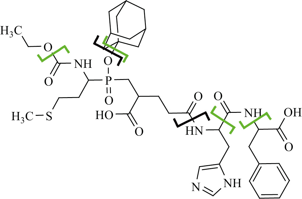 Кроме того, тетрапептид 1 был дополнительно исследован с помощью масс-спектрометрии высокого разрешения. На схеме 3 особенности фрагментации молекулы фосфинового тетрапептида 1 в условиях масс-спектромерии на основе сигналов идентифицированных фрагментов. Черным отмечена фрагментация в условиях ионизации электроспреем, зеленым фрагментация в условиях тандемной масс-спектромерии. Детальные данные масс-спектрометрии HRMS приведены в Дополнительных материалах.
