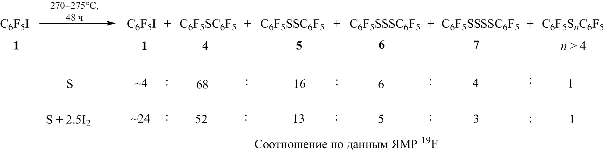 Реакции иодпентафторбензола 1 с серой, а также с серой и иодом. Нагревали запаянную ампулу со смесью иодарена 1 (0.146 г, 0.50 ммоль) с серой (0.016 г, 0.50 ммоль) при 270–275°C в течение 48 ч. По окончании выдержки ампулу охлаждали, вскрывали, содержимое экстрагировали ~2 мл CHCl3. Согласно данным ЯМР 19F, смесь содержала соединения 1, 4, 5 в соотношении ~4:68:16 наряду с предполагаемыми сульфанами 6, 7 и полисульфанами (С6F5SnС6F5, n > 4) в соотношении ~6:4:1 соответственно. В тех же условиях из смеси иодарена 1 (0.146 г, 0.50 ммоль), серы (0.016 г, 0.50 ммоль) и I2 (0.320 г, 1.26 ммоль) в растворе CHCl3, по данным ЯМР 19F, получили смесь продуктов 1, 4–7 и предполагаемые полисульфаны (С6F5SnС6F5, n > 4) в соотношении ~24:52:13:5:3:1 соответственно.