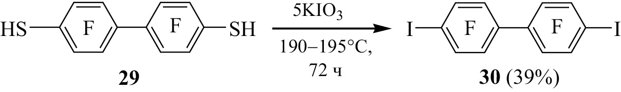 На примере реакции октафтордифенил-4,4′-дитиола 29 с KIO3 осуществлена замена двух тиольных групп в полифторароматическом соединении на атомы иода, приводящая к 4,4′-дииодоктафтордифенилу 30 (схема 8). Наличие двух тиольных групп в соединении 29, видимо, влияет на смягчение условий реакции этого соединения с KIO3 по сравнению с условиями превращения тиола 10.