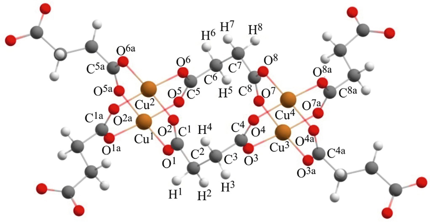 С целью точной интерпретации полос в экспериментальных ИК спектрах исследуемых соединений был осуществлен DFT квантово-химический расчет колебательных частот с предварительной оптимизацией геометрии на уровне B3LYP-D3BJ/6-311G(d,p). В основу расчета положено предположение о том, что синтезированные вещества имеют структуру, аналогичную структуре сукцината меди(II), полученного методом обмена лигандов и описанного в работе [27]. Оптимизированная структура фрагмента полимерной цепочки представлена на рис 2.