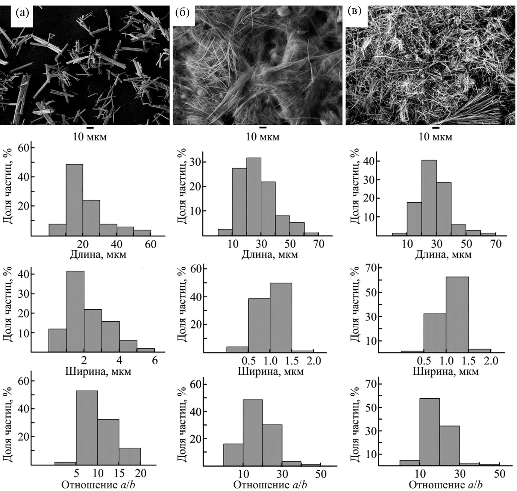 Рис. 5. Электронно-микроскопические изображения и гистограммы распределения по размерам микроволокон оксида меди(II): CuO–1 (а), CuO–2 (б), CuO–3 (в).