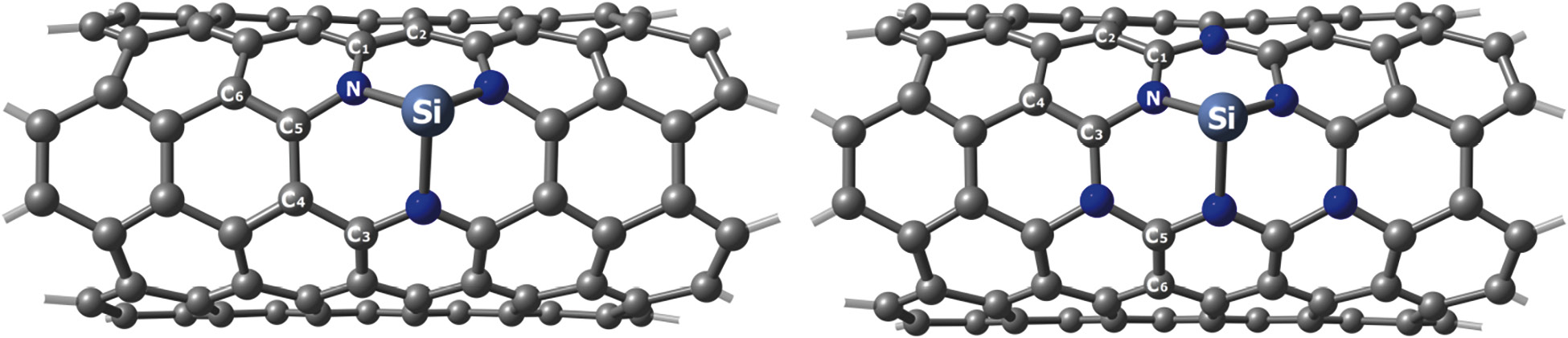 Рис. 1. Фрагменты модельных структур SiN3-допированных (6,6)-кресельных углеродных нанотрубок SiN3/CNT (а) и SiN3/N3CNT (б).