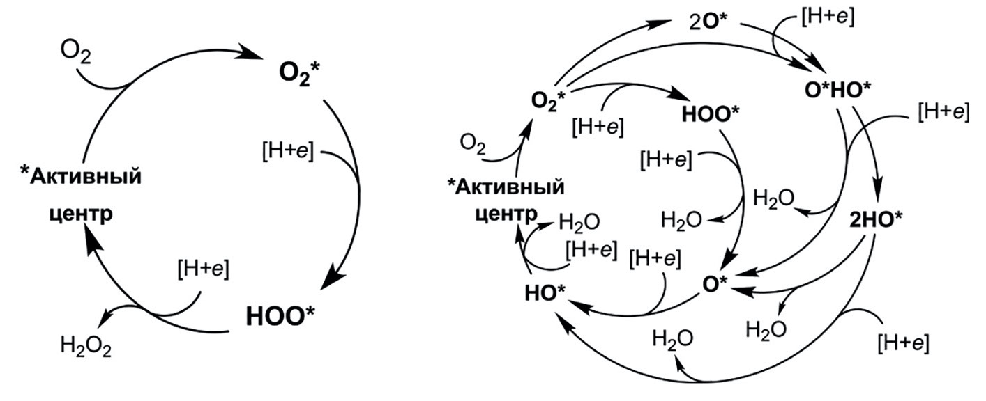 Каталитические циклы 2e- и 4e-маршрутов реакции восстановления кислорода представлены на рис. 2.