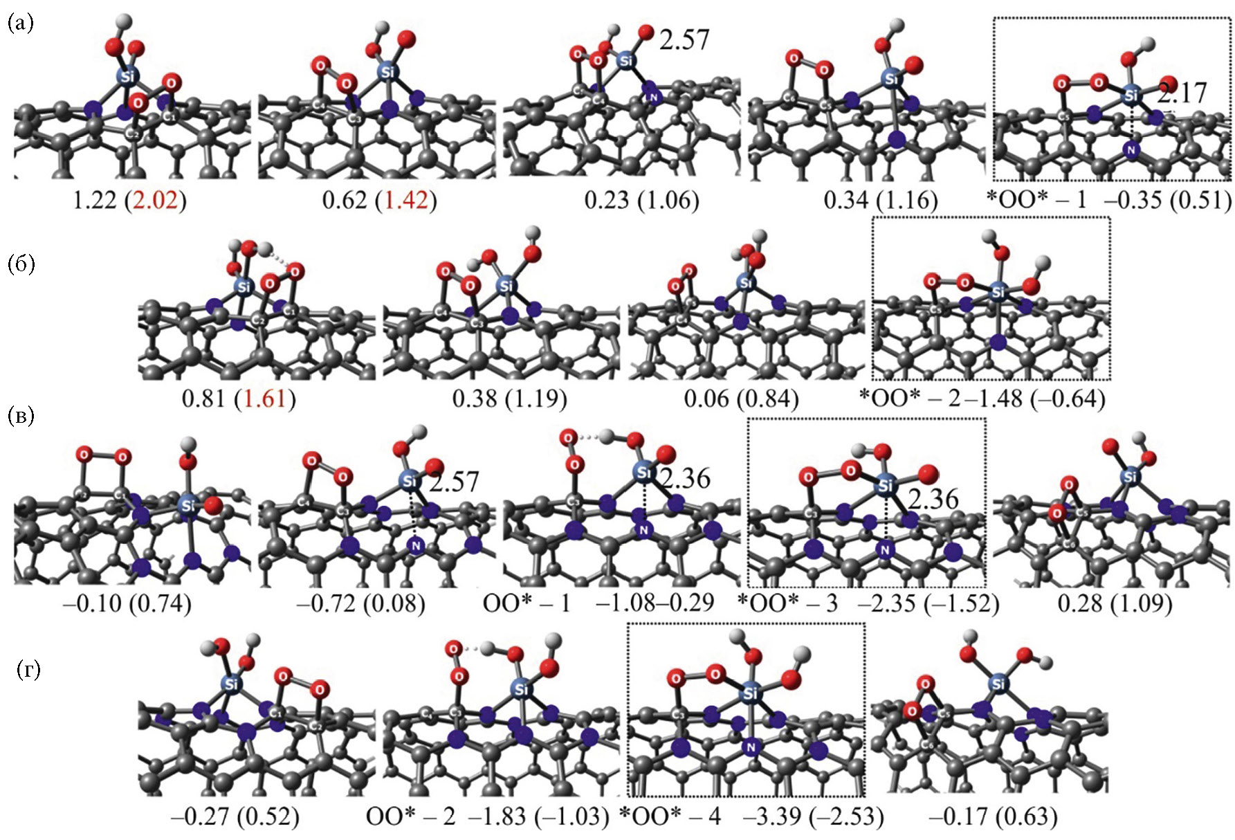 Рис. 4. Структуры O2*-адсорбатов на Si-отравленных катализаторах: Si(O)(OH)N3/CNT (а), Si(OH)2N3/CNT (б), Si(O)(OH)N3/N3CNT (в) и Si(OH)2N3/N3CNT (г). Под структурами приведены соответствующие величины DE и DG, эВ (в скобках). Красным цветом отмечены величины DG, рассчитанные по формуле DG(O2*) = 0.99DE + 0.81. Наиболее стабильные адсорбаты выделены пунктиром.