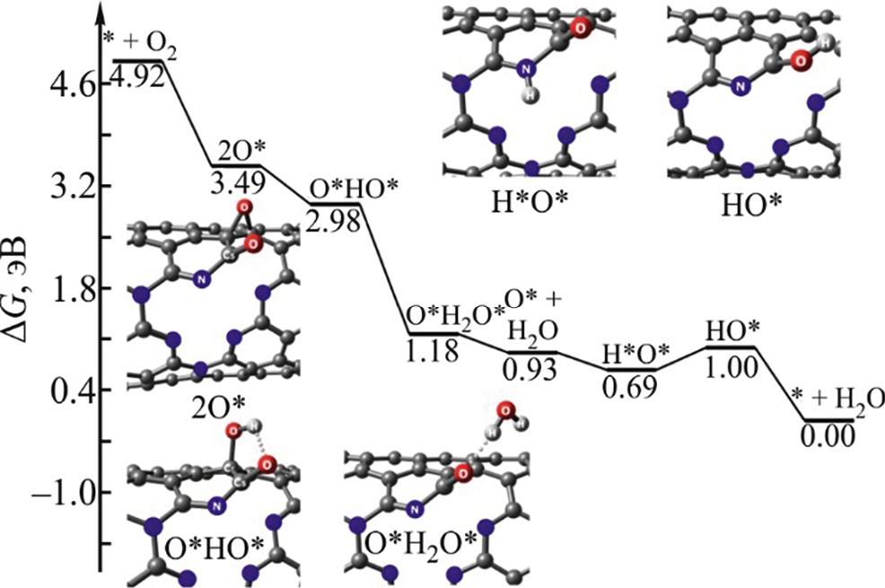 Для подтверждения данной гипотезы построен профиль свободной энергии реакции восстановления кислорода на углеродной нанотрубке, допированной азотом пиридиновой и графитированной природы, N3/N3CNT, сформированной в результате элиминирования атома кремния (рис. 7). Наиболее активным на начальной стадии реакции восстановления кислорода оказался винильный фрагмент C5=C6 (см. рис. 1). Оптимизация геометрии O2*-адсорбата на нем привела к спонтанному разрыву связей O–O и С5–N и образованию эпоксипиридин-2-она 2O*, что указывает на протекание реакции восстановления кислорода исключительно по 4e-диссоциативному маршруту. Восстановление эпоксигруппы 2O*-адсорбата протекает самопроизвольно по пути (3):