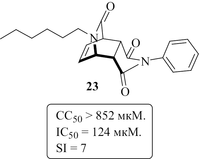 На следующем этапе исследования проведена оценка цитотоксичности и способности соединений 14–26 подавлять репродукцию аденовируса человека 5 типа (AdV5). В качестве препарата сравнения использовали рибавирин из-за широты его противовирусных свойств [25]; для каждого образца были определены значения 50% цитотоксической концентрации (CC50), 50% ингибирующей концентрации (IC50) и рассчитаны индексы селективности SI (отношение CC50/IC50). Данные о цитотоксичности и противовирусной активности соединений 14–26 представлены в табл. 1. Как показано в ходе экспериментов, полученные соединения обладали относительно низкой токсичностью для эмбриональных клеток макаки резус (MA-104). Так, 4 из 14 веществ (28.6%) не проявляли признаков цитотоксичности даже в максимальной использованной концентрации (300 мкг/мл). Наиболее токсичными в этом ряду оказались соединения 16 и 21 (СС50 = 195 и 204 мкМ соответственно); отметим, что оба этих соединения получены путем [4+2]-циклоприсоединения N-фенилмалеинимида к 1-[2-(3-иодфенил)-2-оксоэтил]пиридин-2(1H)-ону 4 и 1-пропилпиридин-2(1H)-ону 7. Подавляющее большинство протестированных соединений вирусингибирующей активности не проявили. Как оказалось, единственным образцом, способным в некоторой степени снижать вирусный цитопатогенный эффект (CPE), является 9-гексил-2-фенил-3a,4,7,7a-тетрагидро-1H-4,7-(эпиминометано)изоиндол-1,3,8(2H)-трион 23 с индексом селективности 7, содержащий насыщенный гексильный заместитель атома азота 2-пиридоновой части молекулы (схема 3).