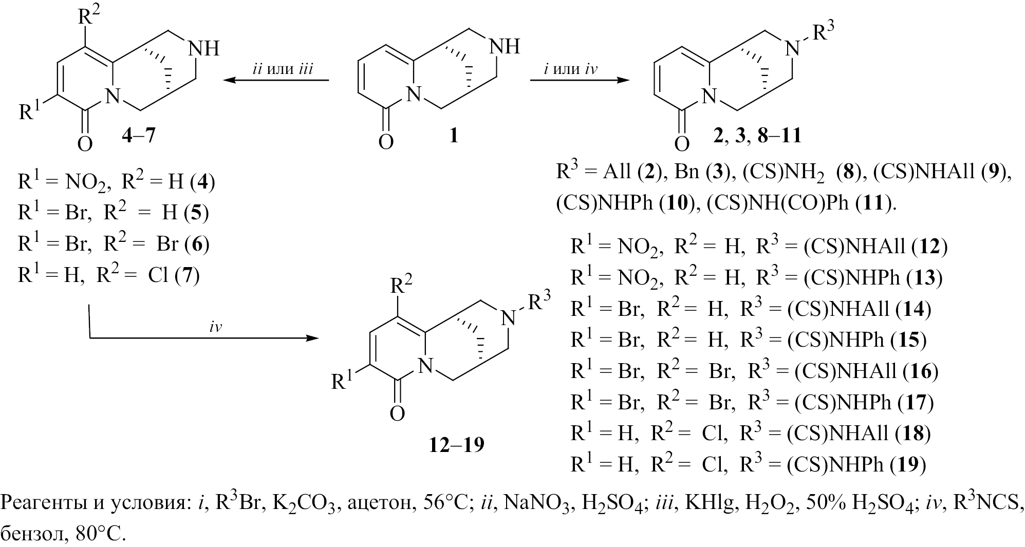 Хинолизидиновый алкалоид – (–)-цитизин 1 (вторичный метаболит растений семейства Fabaceae [25]) – использован в качестве исходного соединения, 3-N-замещенные производные алкалоида 1 (аллилцитизин 2, бензилцитизин 3 и 9-нитро-, 9-бром-, 9,11-дибром- и 11-хлорпроизводные 4–7) синтезированы согласно методикам, описанным в работах [26–28]. Тиомочевины 8–11 получены в соответствии с работами [29–31]. Взаимодействие производных 4–7 с аллил- и фенилизотиоцианатом в кипящем бензоле позволило получить новые цитизинзамещенные мочевины 12–19 с выходами от 75 до 96% (схема 1). Контроль за ходом реакции осуществляли методом тонкослойной хроматографии (ТСХ), соединения выделены методом колоночной хроматографии на SiO2. Строение новых тиомочевин 12–19 установлено на основании данных элементного анализа, ЯМР и ИК спектроскопии.