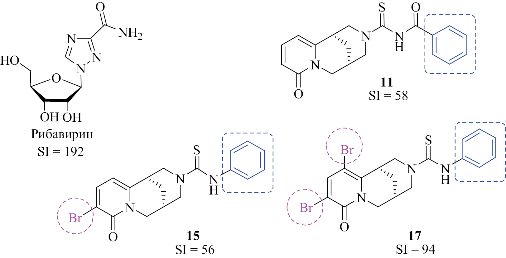 Таким образом, среди протестированных соединений противовирусной активностью обладают производные с атомами брома в 2-пиридоновом ядре исходного (–)-цитизина и/или с бензоил- или фенилтиомочевинным фрагментом в биспидиновой части молекулы. Значение индекса селективности наиболее активного соединения 17, (1S,5R)-9,11-дибром-8-оксо-N-фенил-1,5,6,8-тетрагидро-2H-1,5-метанопиридо[1,2-a][1, 5]диазоцин-3(4H)-карботиоамида, близко к 100.