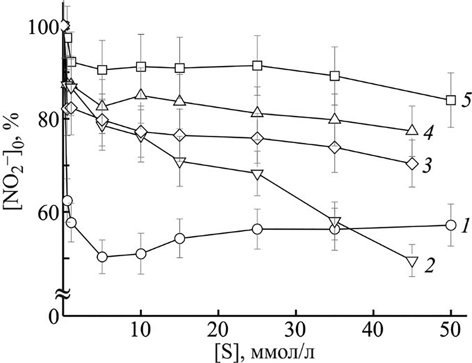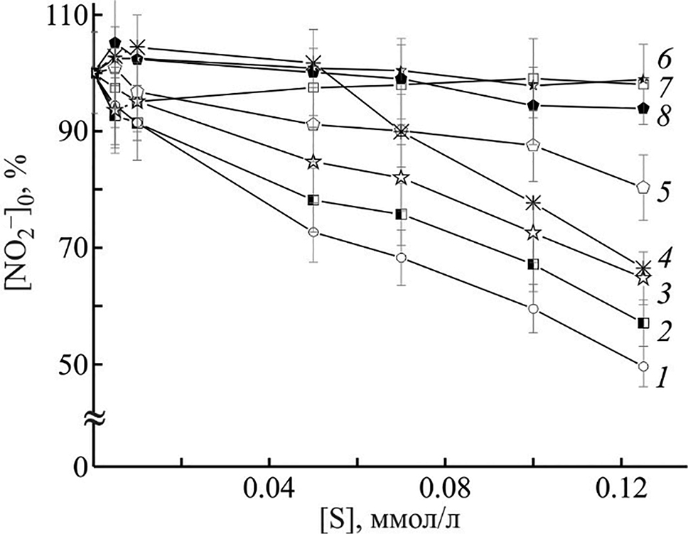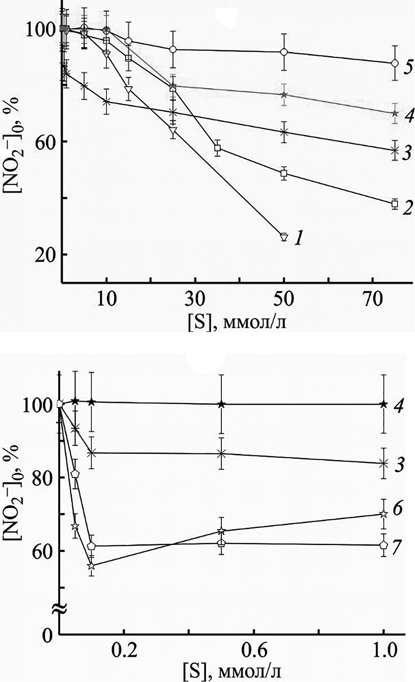 Известно [42, 43], что нитропруссид натрия под воздействием света в водной среде (рН = 7.4) спонтанно разлагается с выделением NO. Нитрозил-радикал в аэробной среде окисляется до устойчивого метаболита, нитрит-аниона, через стадии образования промежуточных интермедиатов, как указано на схеме 1. Эффективность используемой тест-системы предварительно оценивали по известным акцепторам активных форм азота (NaN3, пиперазин, дофамин, Н2О2, аскорбиновая кислота, 6-гидрокси-2,5,7,8-тетраметилхроман-2-карбоновая кислота) [44–50]. Полученные данные подтверждают то, что тест-система на основе нитропруссида натрия позволяет оценить общую активность соединения в отношении NOх (•NO, NO2, N2O3) в физиологически значимых условиях. Концентрация NO2– в тест-системе в присутствии исследуемых соединений в сравнении с контрольной без добавок таковых выступает мерой их способности регулировать уровень NOх.