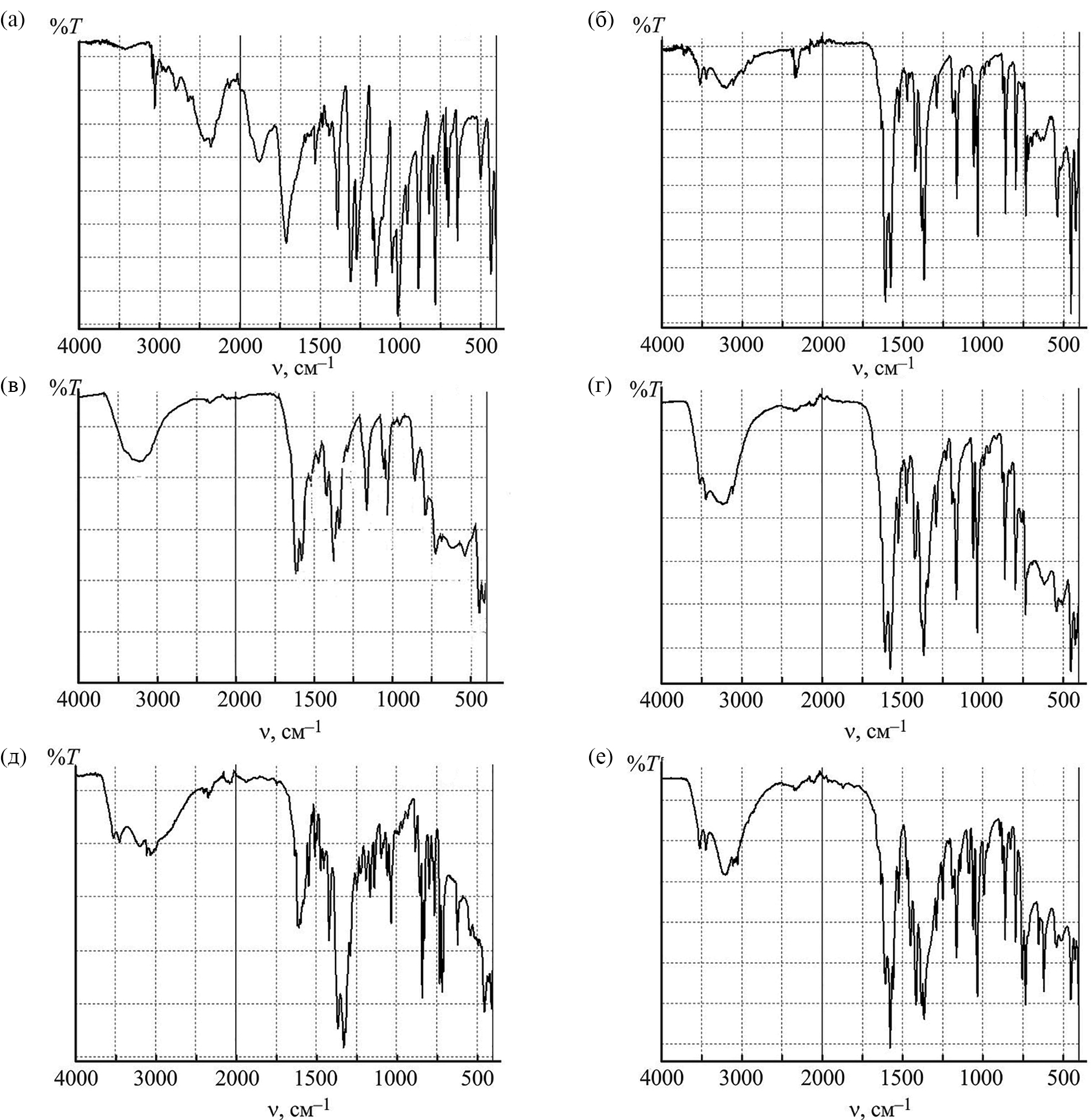 Рис. 4. ИК спектры образцов: pyca (а), Eu(pyca)3tppo∙H2O (б), Eu(pyca)3(H2O)2 (в), Eu(pyca)3(dphg)2(H2O)2 (г), Eu(pyca)3phen∙H2O (д), Eu(pyca)3(dipy)2(H2O)2 (е)