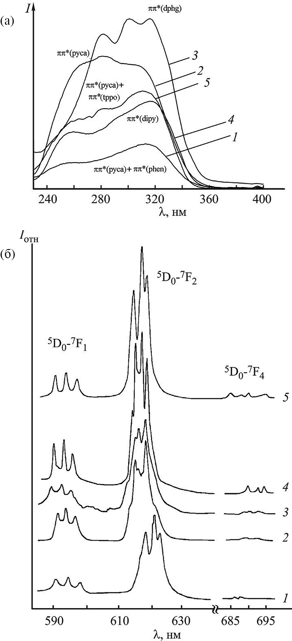 Рис. 5. Спектры возбуждения люминесценции (а) и люминесценции (б): 1 – Eu(pyca)3phen∙H2O, 2 – Eu(pyca)3(H2O)2, 3 – Eu(pyca)3(dphg)2(H2O)2, 4 – Eu(pyca)3(dipy)2(H2O)2, 5 – Eu(pyca)3tppo∙H2O (293 K)