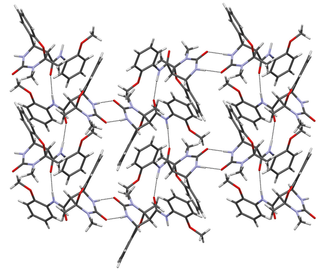 Соединение 3 кристаллизуется в центросимметричной пространственной группе триклинной сингонии в виде рацемата (рис. 1). Кристаллографически независимая часть элементарной ячейки содержит две молекулы, являющиеся энантиомерами (на рис. 1 вторая молекула не изображена). Каждая из независимых молекул в кристалле связана в центросимметричные димеры за счет межмолекулярных водородных связей N–H∙∙∙O с участием пиримидиноновых фрагментов. В свою очередь, димеры за счет водородных связей N–H∙∙∙O с участием амидных групп соседних молекул связаны в бесконечные двумерные сети (рис. 2).