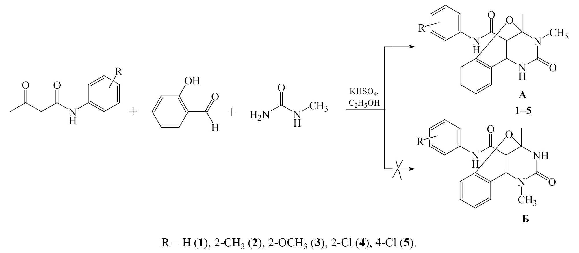 Установлено, что взаимодействие N-арил-3-оксобутанамидов, салицилового альдегида с N-метилмочевиной при кипячении в этаноле в присутствии KHSO4 в течение 1 часа приводит к образованию N-арил-2,3-диметил-4-оксо-3,4,5,6-тетрагидро-2H-2,6-метанобензо[g][1, 3, 5]оксадиазоцин-11-карбоксамидов 1–5 (схема 1).