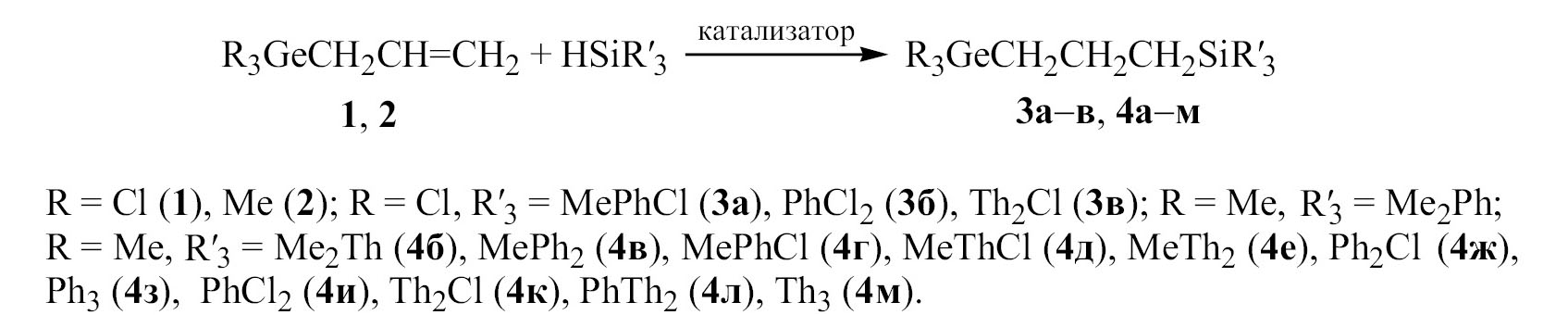 Недавно нами были изучены реакции гидросилилирования и гидрогермилирования аллилсиланов и -германов [1–3] и синтезировали ряд 1,3-бис(силил/гермил)пропанов R3M(CH2)3MR3 (М = Si, Ge; R = Cl, OEt, Me) с целью последующего изучения их биологической активности. В настоящей работе получены новые изоструктурные соединения, содержащие в молекулах ароматические заместители (Ph, Th) и изучены закономерности протекания проводимых реакций.