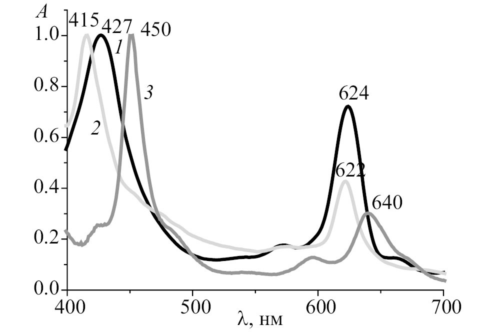 На рис. 2 представлены электронные спектры поглощения комплексов 4–6. Можно видеть, что комплексообразование с кобальтом приводит к гипсохромному смещению полосы Q по сравнению с ее положением в спектре комплекса цинка на 7 нм, с медью – на 9 нм. Образование комплекса с марганцем напротив, сопровождается батохромным (9 нм) сдвигом первой полосы. Что касается положения полос В, то в спектре соединения 4 она находится в той же области, что и в спектре комплекса цинка 3, в спектре комплекса 5 – смещена гипсохромно на 13 нм, а в спектре соединения 6 – батохромно на 22 нм. В общем, подобные спектральные свойства характерны и для других тетрабензопорфиринатов Co(III) [17], Cu(II) [18] и Mn(III) [19].