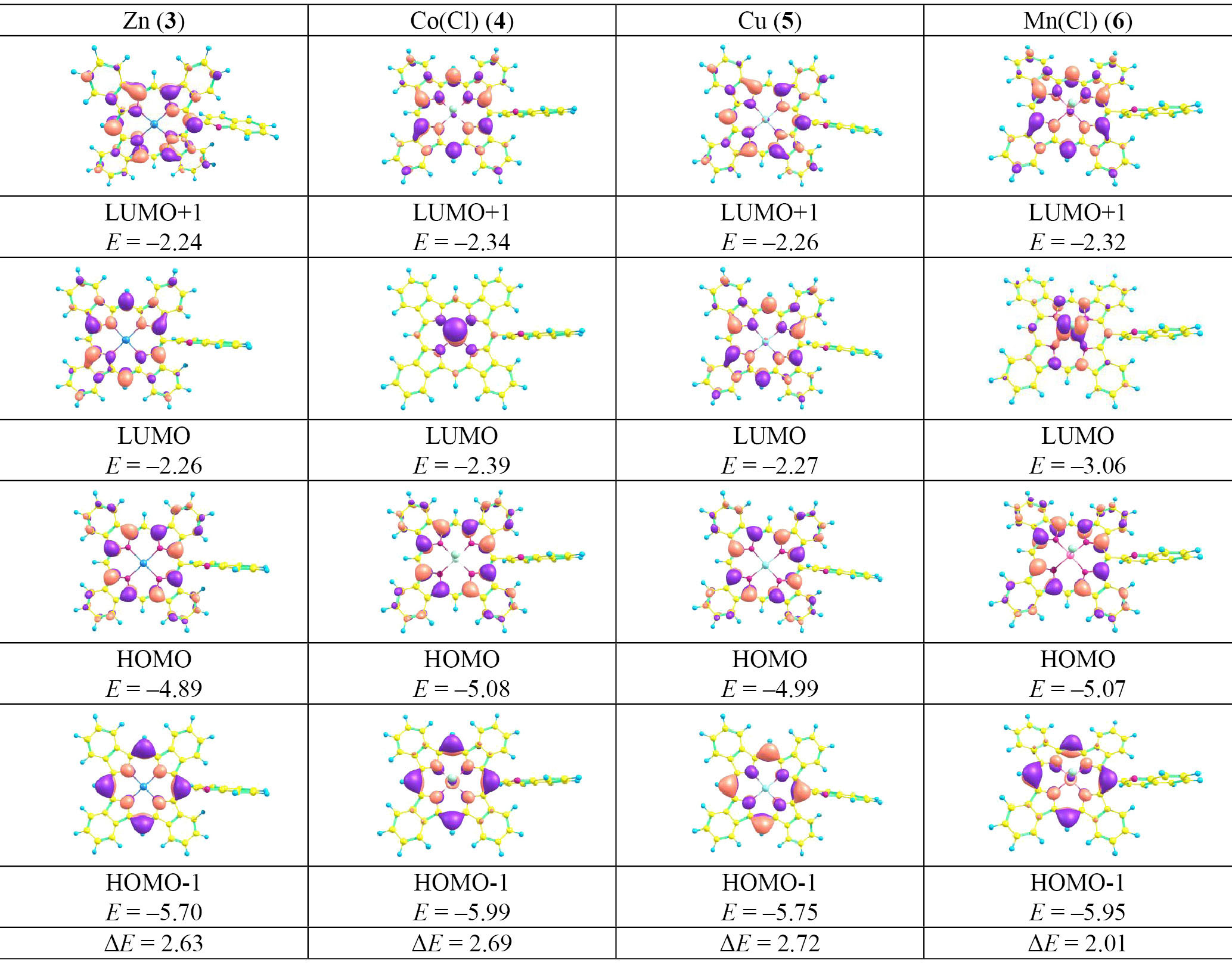 Для обоснования влияния ионов металлов на спектральные свойства синтезированных соединений нами проведены квантово-химические расчеты молекулярного и электронного строения их молекул методом DFT [20]. Расчеты проводились при помощи программного комплекса Firefly 8.2.0 [21]. Посторенние начальных геометрий, обработка и представление результатов выполнены с использованием программного комплекса Chemcraft [22]. При расчетах использовали обменно-корелляционный функционал PBE0 [23] в сочетании с базисом def2-TZVP [24], поскольку их применимость показана ранее при расчетах металлокомплексов тетрабензопорфирина [9, 25]. В результате расчетов определены формы и энергии граничных орбиталей в молекулах комплексов 3–6 (рис. 3).