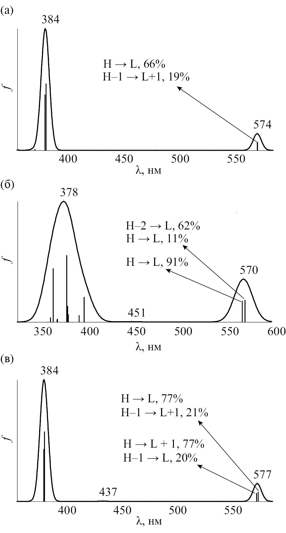 Рис. 4. Рассчитанные электронные спектры поглощения комплексов 3 (а), 4 (б), 6 (в).