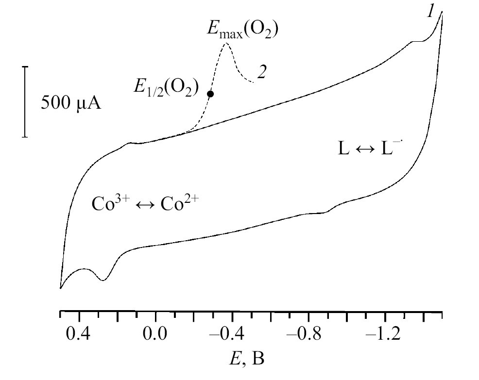 На рис. 5 в качестве примера представлены циклические вольтамперные кривые, полученные для электрода, модифицированного комплексом кобальта 4, полученные в результате измерений в атмосфере аргона (кривая 1) и после насыщения электролита кислородом (кривая 2). На кривой 1 присутствуют катодные и анодные максимумы, отвечающие процессам окисления – восстановления как иона металла (M), так и макроциклического лиганда (L). На второй кривой появляется новый интенсивный максимум в области потенциалов –0.1÷–0.35 В, характеризующий процесс восстановления кислорода. Циклические I–E-кривые, полученные для порфирина 1 и комплексов 3, 5, 6, имеют такой же характер и отличаются положением и количеством максимумов на кривых. Для металлокомплексов характерны одна стадия электровосстановления (окисления) тетрабензопорфинового макрокольца. Показано, что в щелочном электролите электронные переходы свойственны для металлоцентров переменной валентности: процессы электровосстановления фиксируются для Co3+ ↔ Co2+ при Ered/ox = 0.23 В, для Cu2+ ↔ Cu1+ при Ered/ox = –0.36 В и Mn3+ ↔ Mn2+ при Ered/ox = –0.01 В. Наблюдаемые процессы по значениям потенциала и количеству электричества могут быть отнесены к квазиобратимым одноэлектронным процессам.